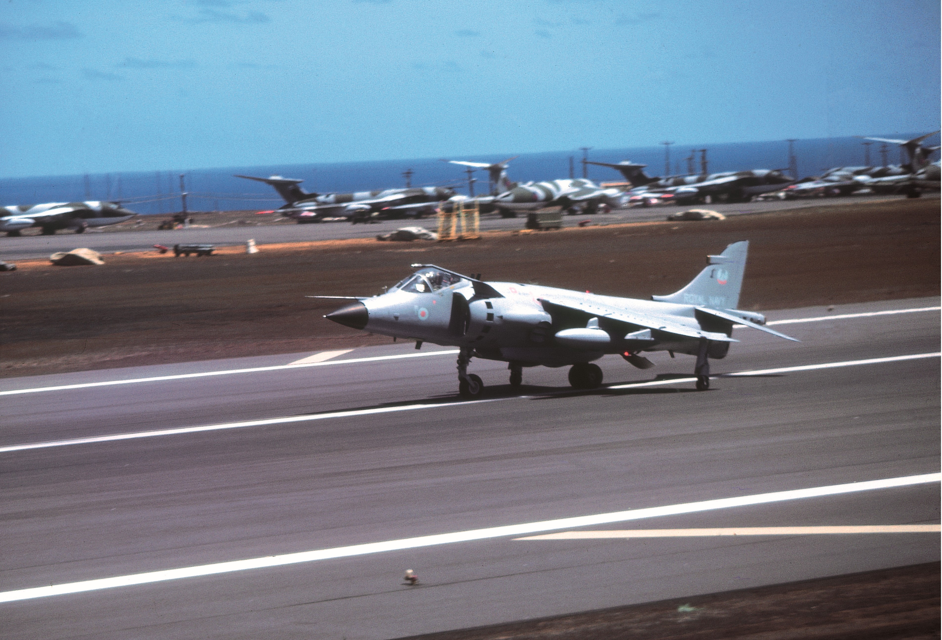 The ferry fuel tanks were removed from all aircraft during post flight servicing on Wideawake. On the 6th May the eight SHARs were flown from Wideawake airfield, and after a short systems check, landed on the MV Atlantic Conveyor anchored in Georgetown Harbour, Ascension. This was followed by the 6 GR3s.